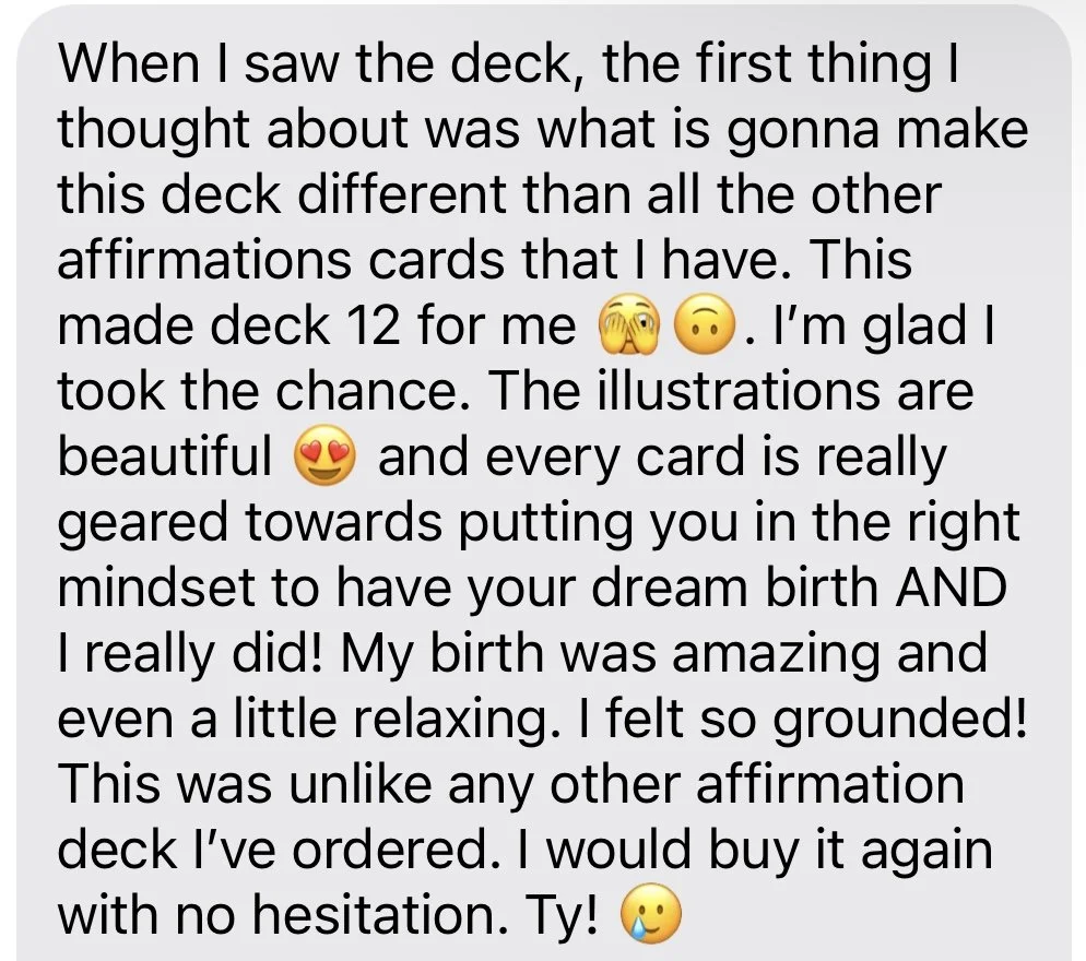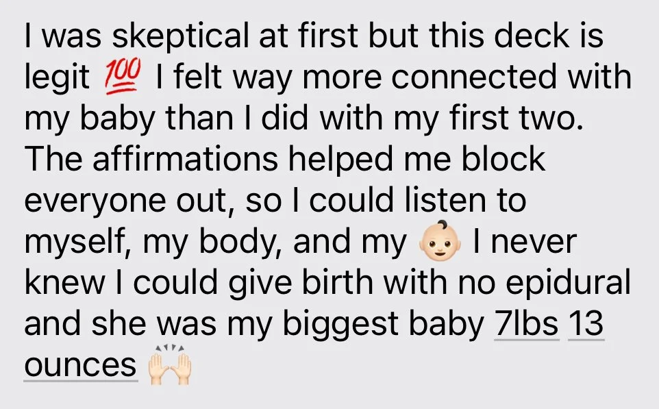Whether you're preparing for your first birth or seeking to enhance a previous experience, the Deck is the perfect tool for navigating the emotional and physical aspects of pregnancy. These affirmations are more than just "words"; they’re a powerful force that will carry you through pregnancy, labor, and birth, grounding you in your strength and guiding you through each contraction with grace and confidence.